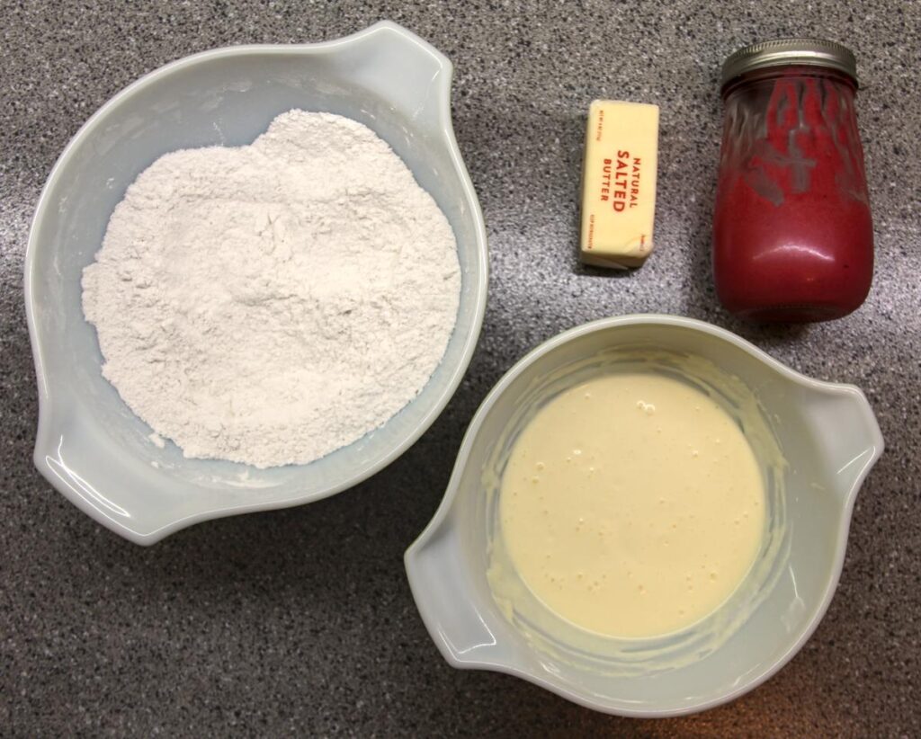 Start by prepping your ingredients. If you are going to make raspberry curd from scratch, see my recipe here and plan ahead a couple of hours – the raspberry curd needs some time to chill in the freezer.