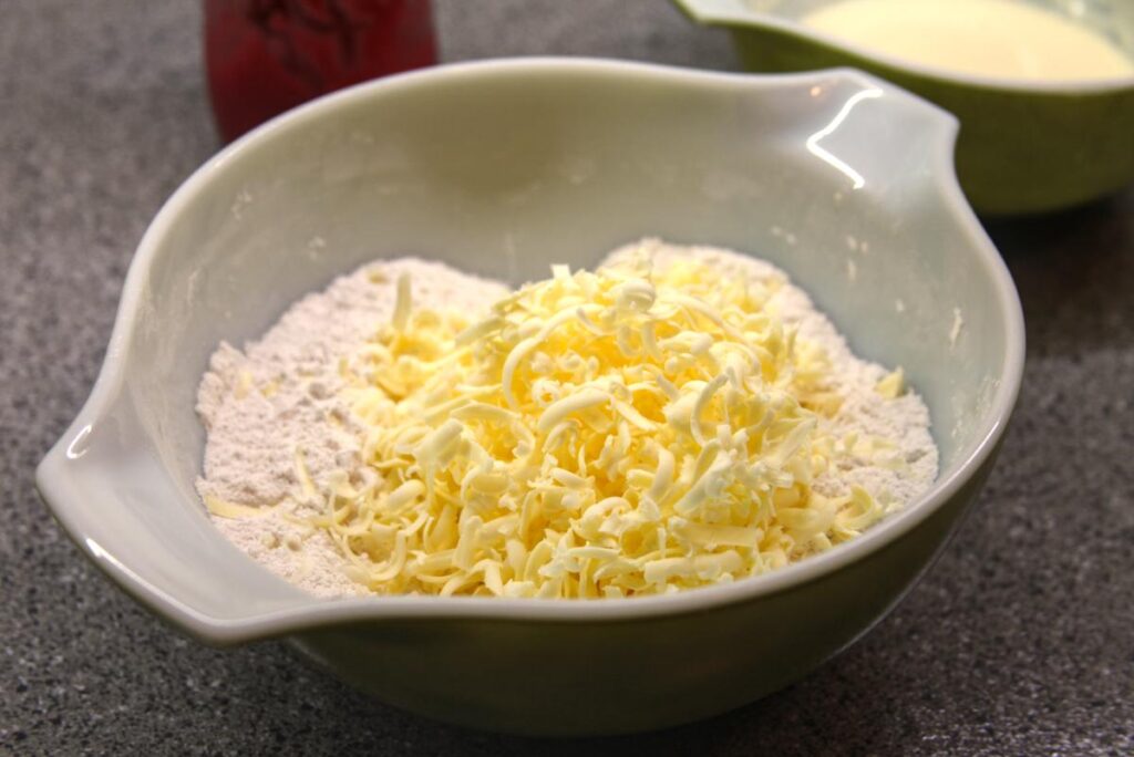In a medium bowl, whisk together dry ingredients. Grate the frozen butter into the dry ingredients, then stir in until the butter is thoroughly distributed into the flour.