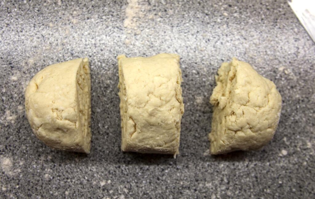 To make scones with layers of raspberry curd, use a knife or bench scraper to divide the dough into three roughly equal sections. For an alternate shaping method, see the end of this section.