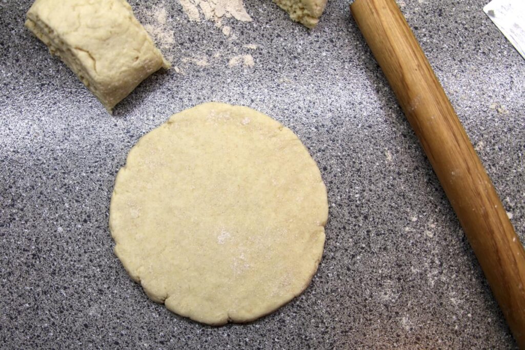 Slice into six equal sections with a sharp knife. Arrange on a parchment lined baking sheet and dust the top of each scone with granulated sugar.