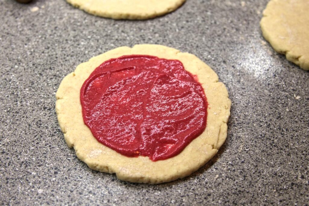 Stack one raspberry curd covered disk on top of the other, being careful not to apply pressure to the center. Place the raspberry free dough round on top.