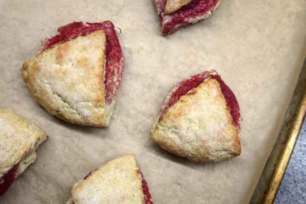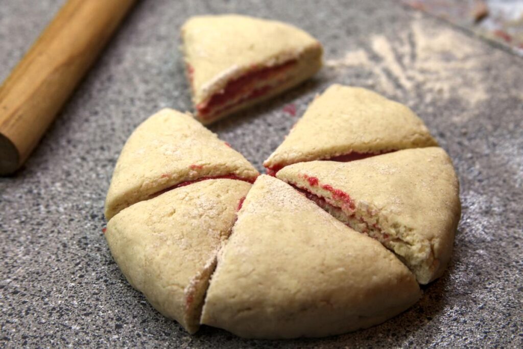 Using a sharp knife, cut the scones into six equally sided wedges. Some of the raspberry curd will squish out, but that’s okay. You can grease the knife to make this process slightly easier.