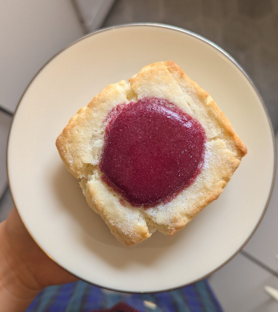 Alternate shaping method: Do not divide the dough into three equal pieces. Instead, roll out the dough into a roughly 6 inch by 9 inch rectangle. Cut the rectangle into six 3 inch squares, then use your fingers or the bottom of a small glass to press the center of the square to make a depression. There should be a raised rim around the endge of the biscuit. Fill with between one and two tablespoons of raspberry curd or jam. Arrange on a baking sheet and dust the tops with granulated sugar.