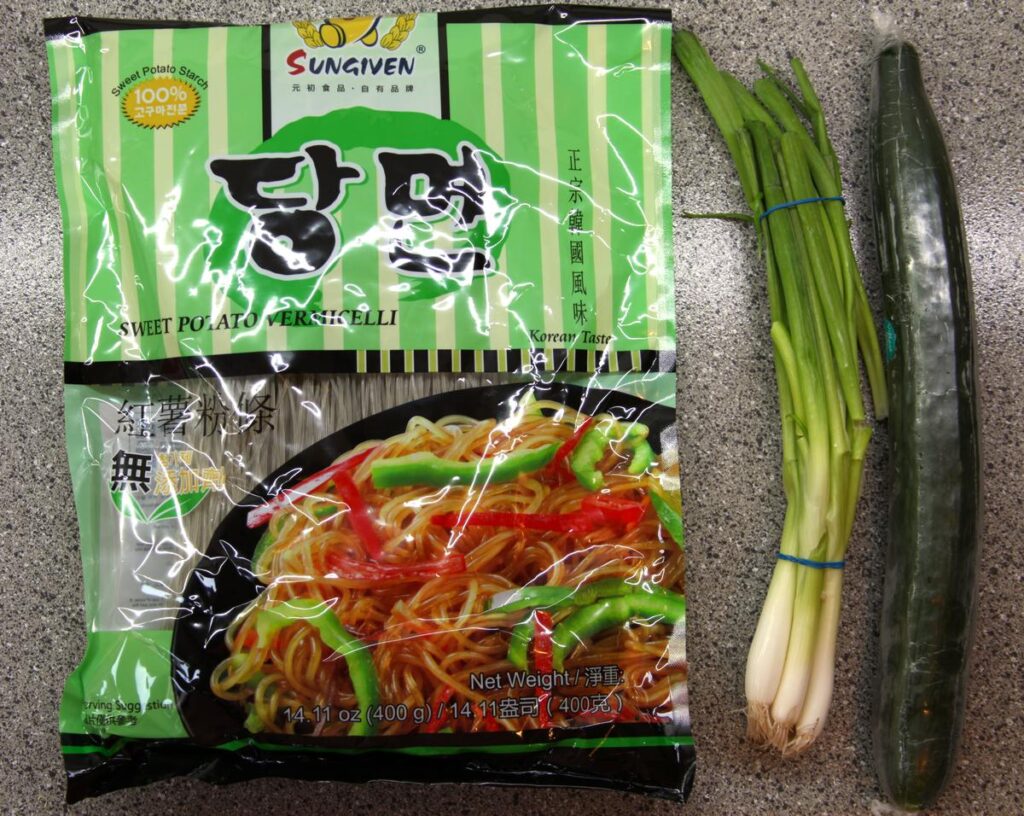 Drain the noodles, if you haven’t already, then toss with the cucumbers and the sauce. The noodles can be chilled or served immediately.