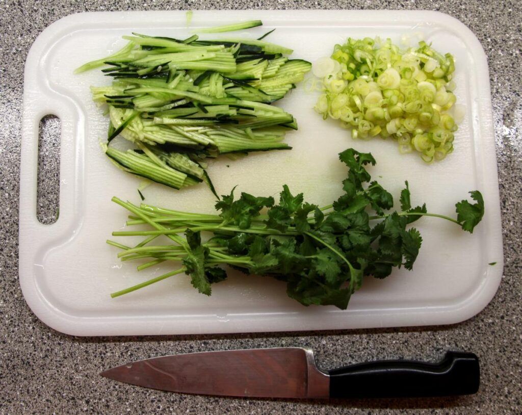Julienne cut the cucumber. Cut the green onion into thin rounds, setting aside the green parts. Roughly chop the cilantro leaves and stems. Set the vegetables aside.