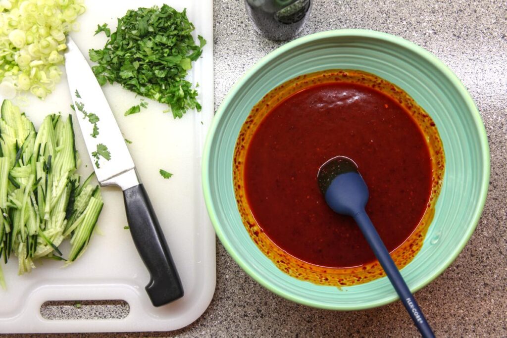 After your veggies are chopped, it’s time to make the sauce. Pick a bowl big enough for the noodles and the vegetables to fit in, then mix together the remaining ingredients. The tahini will act as an emulsifying agent and you will end up with a creamy red sauce. If the oil and water ingredients aren’t mixing, using a wisk should help.