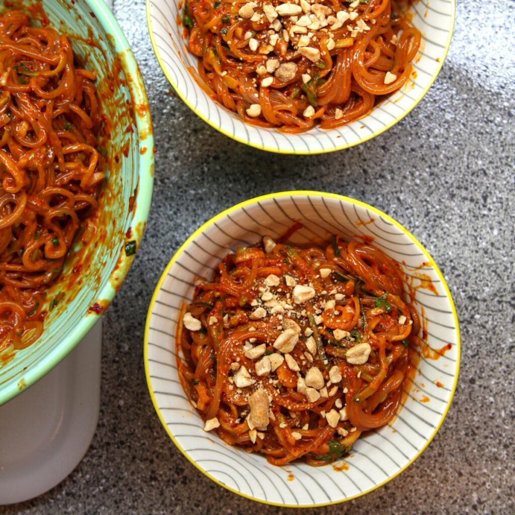 This spicy cucumber noodle salad is phenomenal. The sauce is creamy and tangy and spicy all at once, the noodles are chewy, and there's a bit of a crunch from the cucumber and the peanuts on top. It also scales up beautifully for a potluck or a picnic and if you do have leftovers, the flavor only gets better the next day.