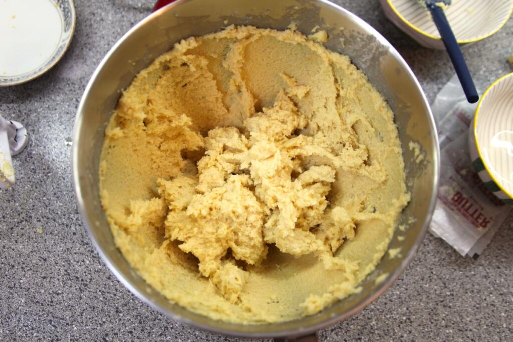 Add one egg to the butter mixture and beat until combined, then add roughly 1/3 of the flour mixture. When the flour has mostly incorporated, repeat the process, alternating egg and flour until both are fully incorporated. The batter will be thick and look slightly rough from the polenta and almond flour.