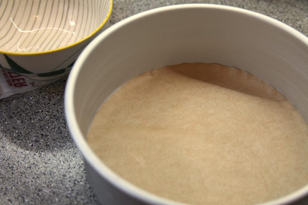 Line the bottom of a 9 inch cake pan with parchment paper and grease the sides. Set aside.