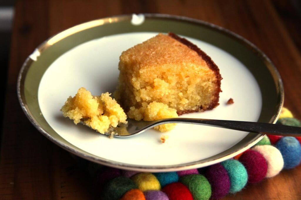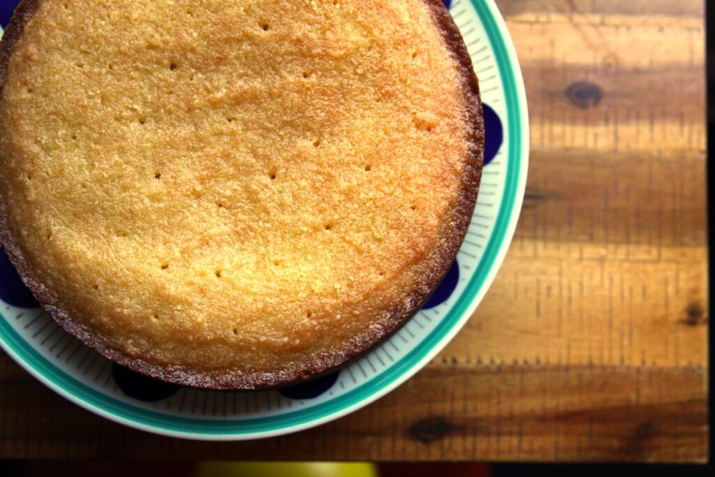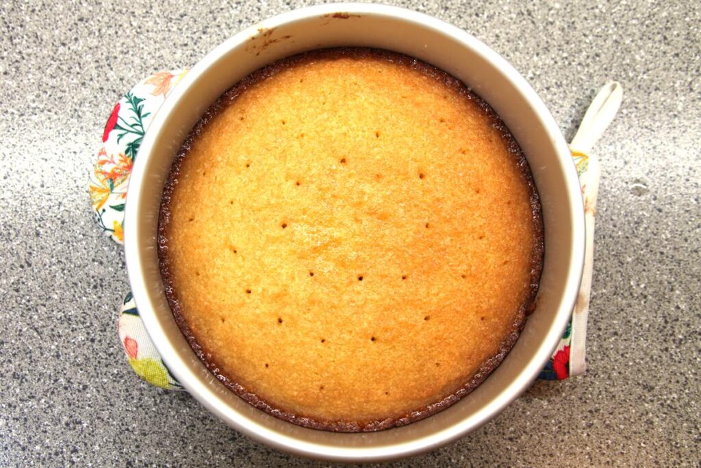 Using a toothpick or skewer, poke holes in the cake 1-1.5 inches apart, then gently pour the syrup over the cake. Let cool completely, then remove from the pan and serve.