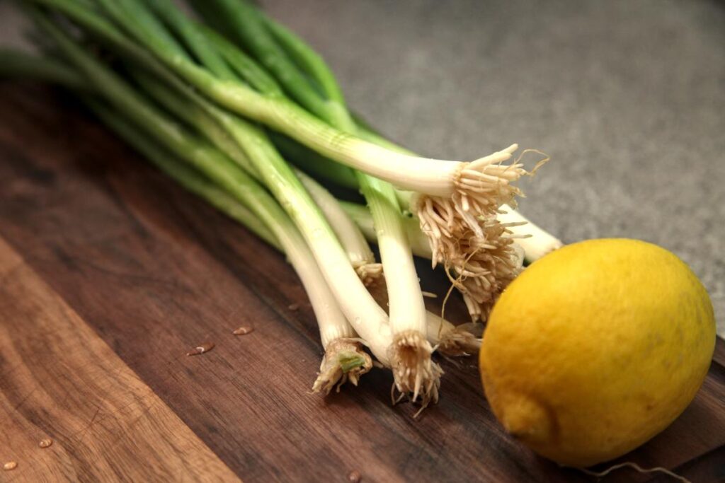 Drizzle the green onions with olive oil, then use a microplane or a fine grater to zest the lemon over the green onions. Sprinkle with salt and then toss to distribute the seasoning evenly.
