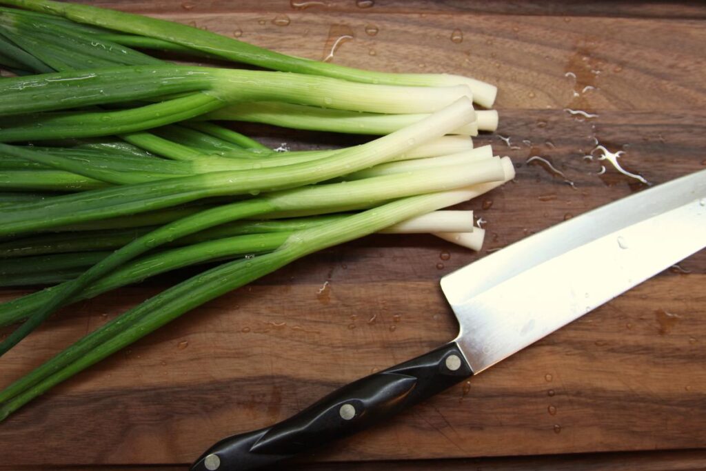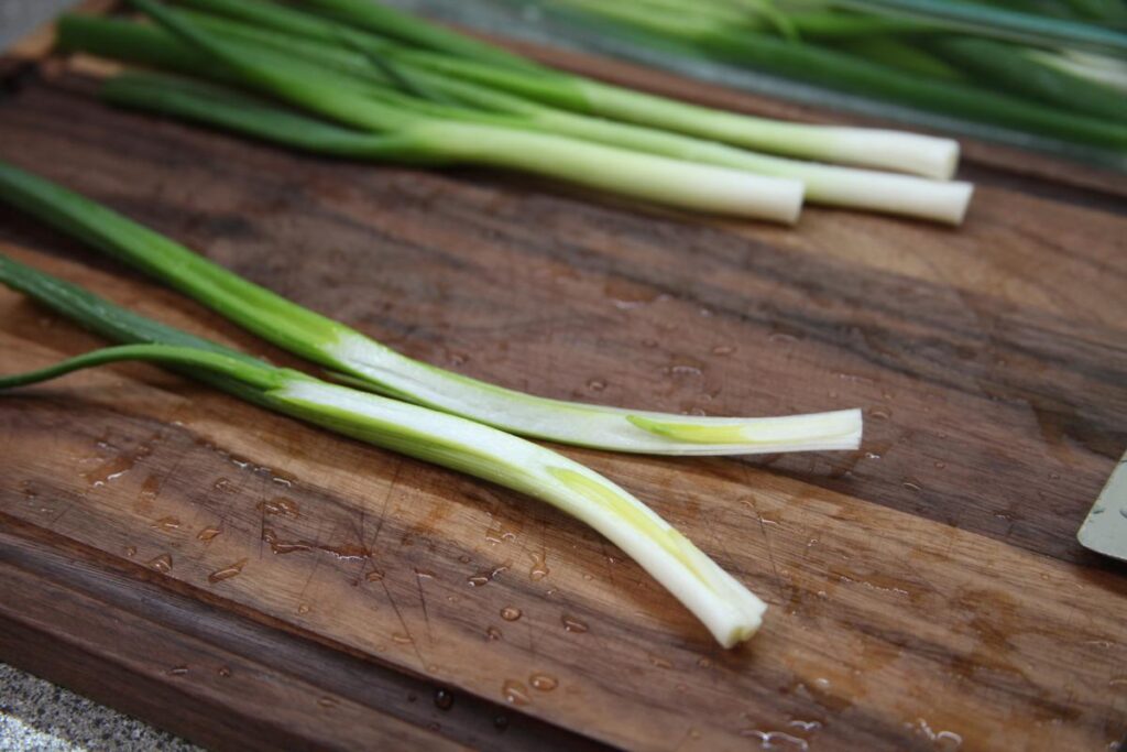 Wash your green onions and trim both the roots and any rough looking tips off the green parts.