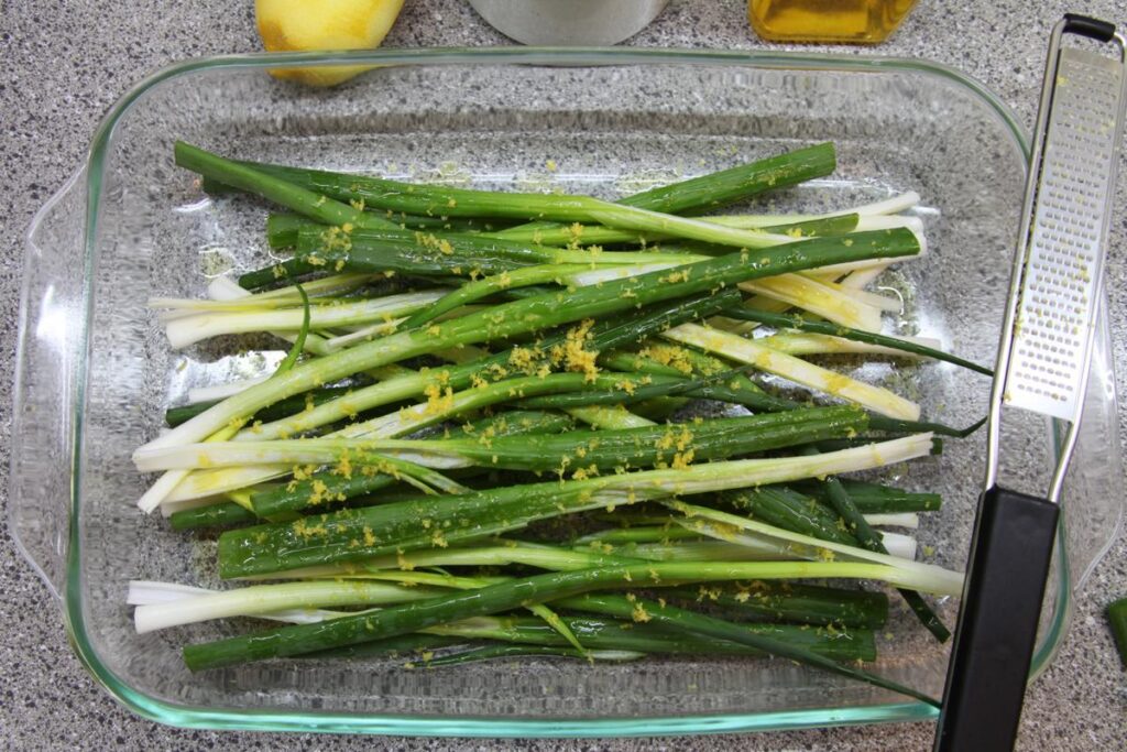 Place prepared green onions in a suitably sized baking dish. Drizzle with olive oil, sprinkle with salt, then zest the lemon over the green onions. Toss thoroughly to coat.