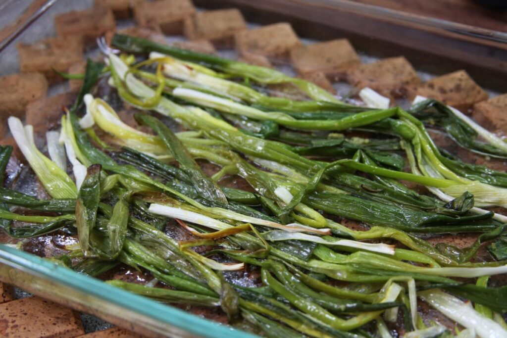 Split the trimmed green onions length-wise and transfer to an appropriately sized baking dish. Ideally, the green onions will be able to fit in a single dense layer on the bottom of the baking dish.