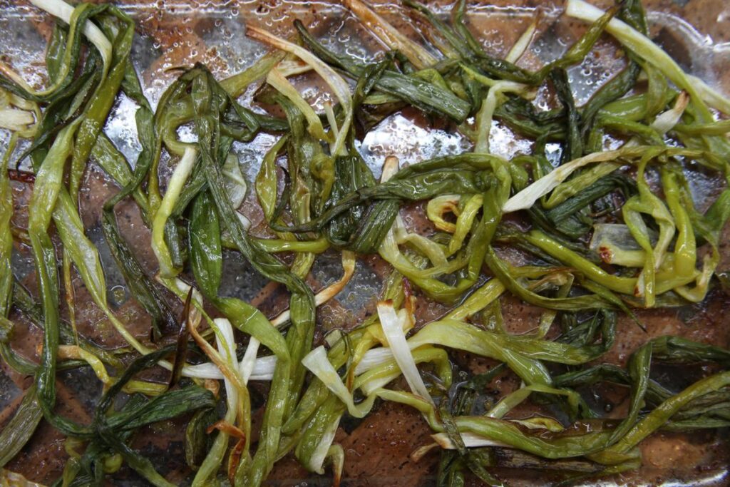 Bake for 15 minutes, then pull the pan out of the oven and toss the green onions. They’ll look soft at this point but not caramelized or crispy. Redistribute them on the pan so they’re spaced evenly, then put back in the oven.